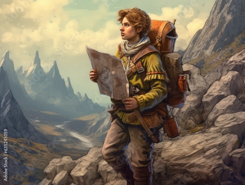 Illustration of a man using a map to navigate while backpacking. Generative AI