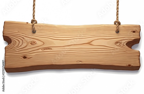 Illustration of wooden plank sign hanging on ropes, isolated. Empty signboard with wood grain texture. Rustic design element for farm, ranch, cafe, bar advertising. Natural material for message,