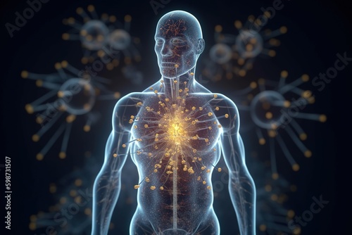 Immune system. A complex network of organs, cells and proteins that defends the body against infection, whilst protecting the body's own cells. Virus, healthy, medical, bacteria. Generative AI