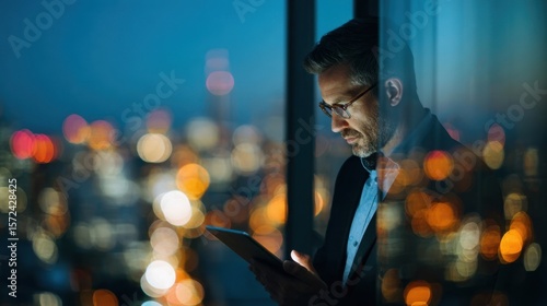 In a highrise office setting a financial analyst intently studies data trends on a tablet with sparkling urban lights reflecting the energy of the city great for corporate finance visuals.