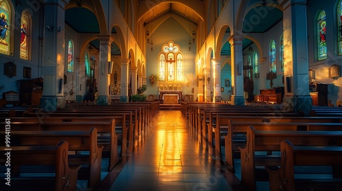In a serene church, soft light illuminates the altar as a parishioner engages in a private moment of confession, reflecting deep spirituality