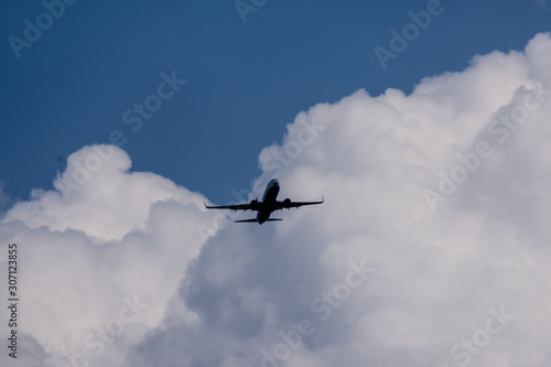 in the background of blue sky and white cumulus clouds in the distance approaching aircraft