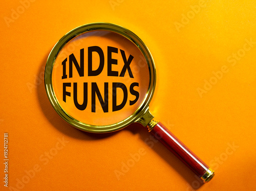 Index Funds symbol. Magnifying Glass with words Index Funds. Beautiful orange background. Business and Index Funds concept. Copy space.