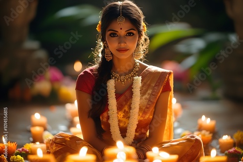 Indian Woman in Golden Saree with Mystical Gaze and Candlelight