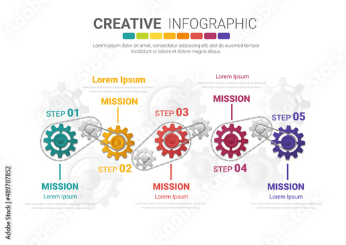 Industry presentation model with gears cogwheels 5 steps. Concept of coordinated work.