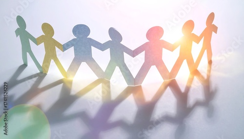 Inspiring paper people hold hands in unity with vibrant rainbow light, symbolizing teamwork, diversity, and hope for a brighter future together