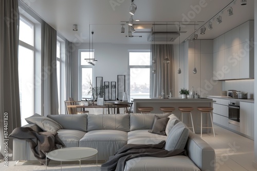 interior, apartment in Scandinavian hygge architectural style, clean modern design featuring grey and white color scheme, beautiful light