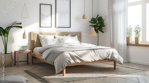 Interior of a bedroom with a wooden bed and a white wall