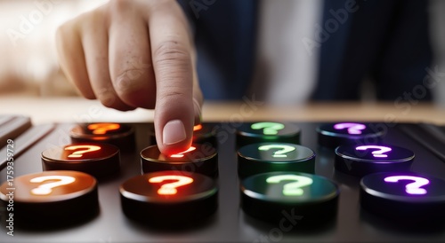 Intriguing Enigma: A finger delicately presses a button bearing a question mark, igniting a sense of curiosity. Generative Ai
