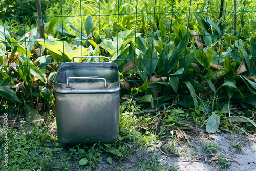 Iron square bucket with water in the garden. A square container filled with water in a flower garden