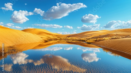 Isolated desert oasis with crystal-clear water, surrounded by golden dunes under a vast blue sky.