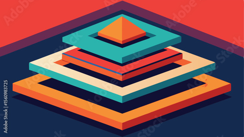 Isometric layered pyramid illustration with vibrant colors and abstract geometric shapes