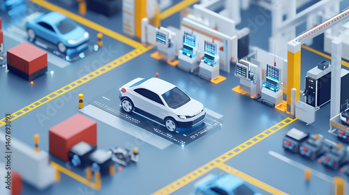 Isometric View of Automated Car Assembly Line in Modern Factory