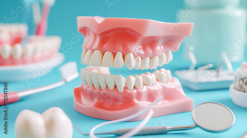 Jaw model, dental tools and toothbrush, Model of a jaw with dental floss on a blue background close-up. Oral care concept