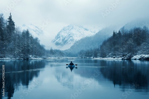 Kayaker paddling on scenic winter lake surrounded by snow-covered trees and mountains