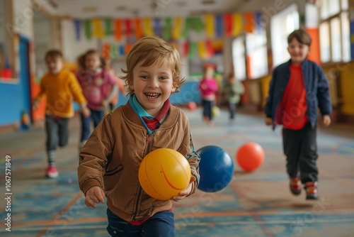 Kids run joyfully in a colorful school gym, playing and having fun with colorful balls
