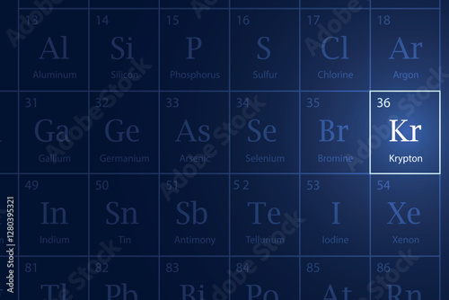 Krypton element glowing in a dark periodic table