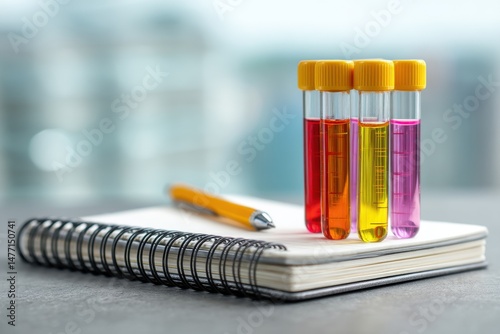 Laboratory analysis with colorful liquids in test tubes, pen and notebook in a bright environment emphasizing health and research for medical applications.