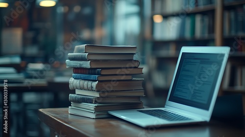 Laptop and Books in Cozy Cafe Setting, A laptop and a stack of books on a wooden table in a cozy cafe setting