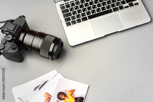 Laptop and camera on the table close up. Printing photos