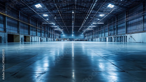 Large empty industrial warehouse interior with polished concrete floor and high ceiling.