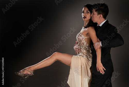 Latin woman and asian man dancing tango ballroom. studio shot