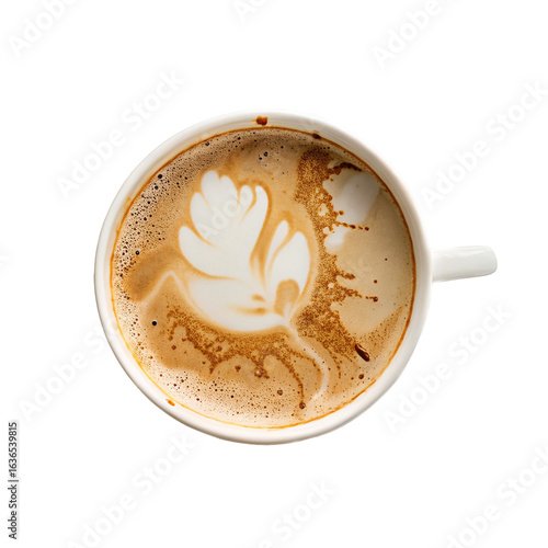 Latte art coffee cup on wooden table with creamy foam design top view background breakfast