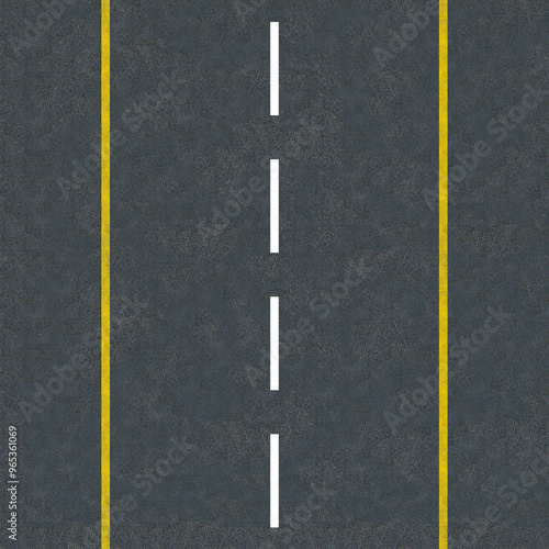 Level asphalted road with two yellow dashed white stripe and pedestrian crossing top view