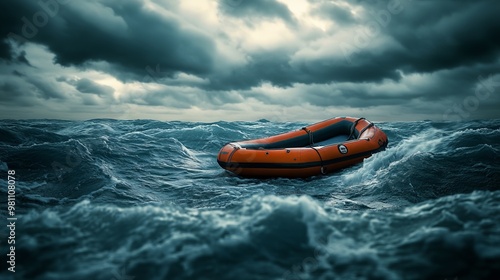 Lifeboat Floating in Stormy Seas with Dark Clouds in Cinematic Style. AI generated illustration