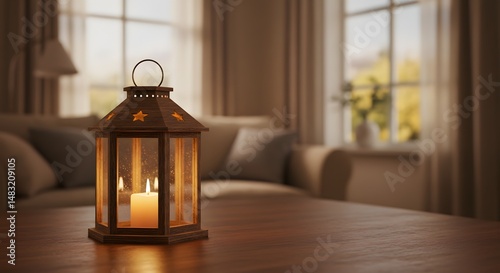 Lit Candle in Lantern on Table with Living Room Background