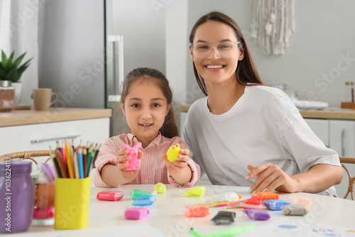Little girl with plasticine figures and her mother in kitchen