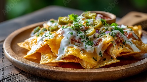 Loaded Nachos with Cheese, Jalape�os, and Cream on a Wooden Plate