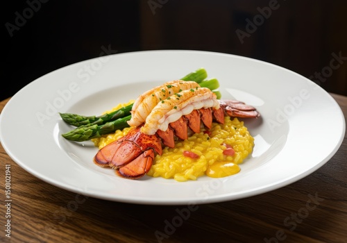 Lobster tail with risotto and asparagus served on a white plate for a fine dining experience