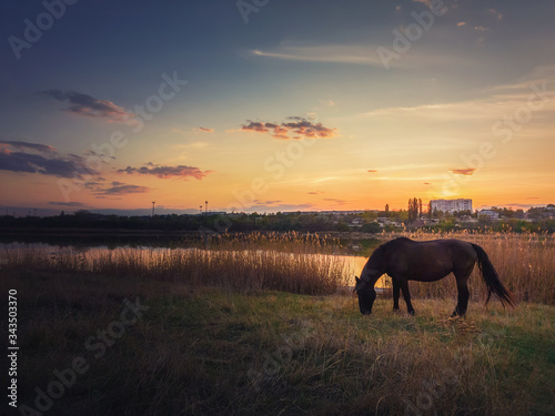 Lone horse silhouette grazing grass on a spring pasture near lake against warm sunset. Idyllic rural landscape and a black mare meets the evening on the meadow. Calm countryside sundown scene.