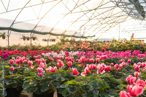 Lot of flowers cyclamen in a greenhouse in winter. Sun light.