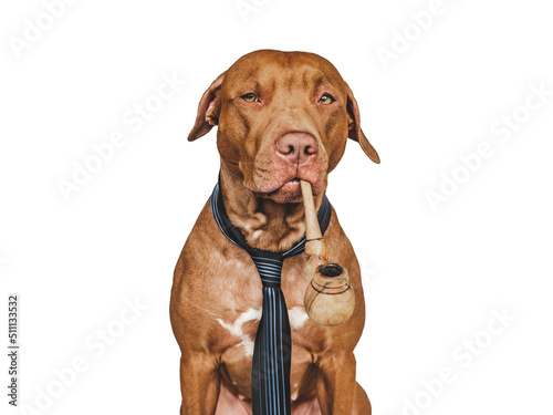 Lovable, pretty brown dog, smoking pipe and smoking pipe. Close-up, indoors. Isolated background. Pets care concept