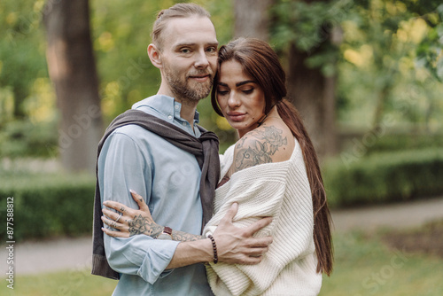 Love, hug and happy with couple in park for romance, bonding and summer vacation. Loving young couple hugging and smiling together on nature background. Beautiful girl with tattooed body outdoor.