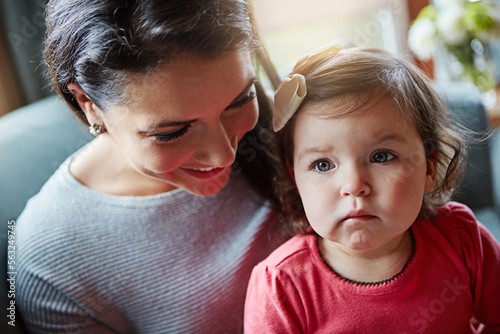 Love, mother and baby daughter on sofa, relax and happiness in lounge, bonding and loving. Motherhood, infant girl and happy mama on couch in lounge, child development and care with nurture or growth