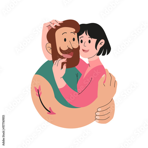 Loving Couple hugging. Bearded man with tattoo and woman with short dark hair. Valentines day romantic vector flat illustration. Tender embrace of loving couple. Feelings and relationships.