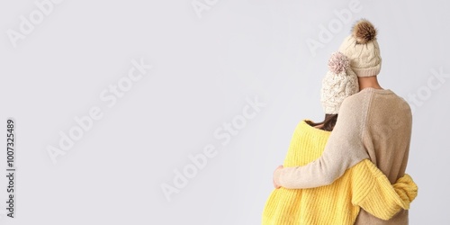 Loving couple in winter clothes hugging on light background, back view. Banner for design