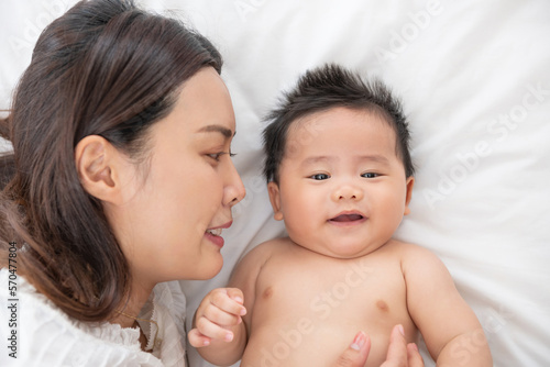 Loving mom carying of her newborn baby at home. Bright portrait of happy mum holding sleeping infant child on hands. Mother hugging her little 6 months old son. Family in the house. Lifestyle.