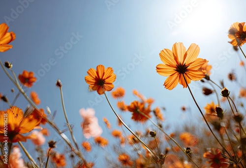 Low-angle shot of orange cosmos flowers reaching toward a bright sun in a clear, blue sky