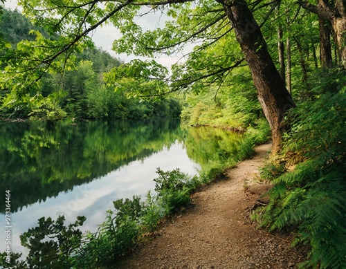 Lush green forest nature background with depth of field for a serene and tranquil atmosphere