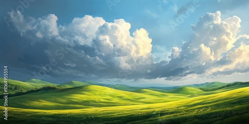 Lush green meadow featuring gently undulating hills beneath a brilliant blue sky adorned with striking clouds that add drama to the picturesque landscape.