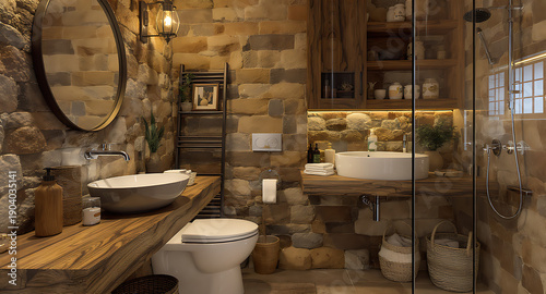 Luxurious Rustic Bathroom Interior Design with Stone Walls and Wooden Accents.