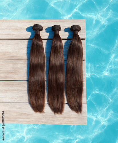 Luxury Black Straight Hair Bundles on Wooden Pool Deck – Virgin Human Hair Extensions for Summer Styling