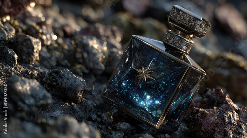 Luxury Dark Blue Perfume Bottle with Star Design on Rocky Surface