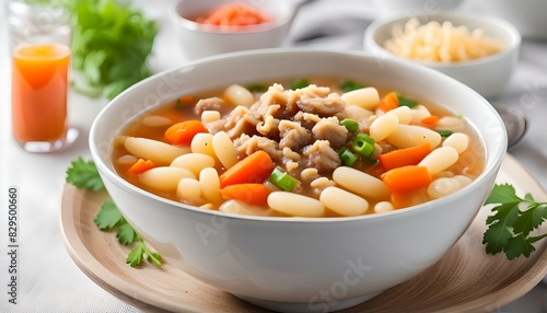 Macaroni Soup with minced pork ,carrots and onion ,easy asian style clear soup in white bowl. Top view
