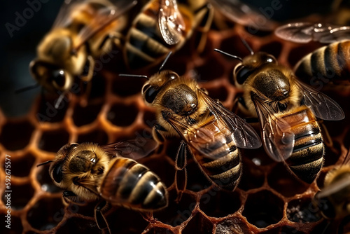 Macro Bee on a honeycomb in a hive. Detailed macro image of a bee collecting honey in a beehive generated by AI.