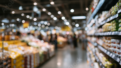 Macro perspective, individual products in sharp focus, shelves filled behind them, shoppers blurred in background, colorful packaging enhanced by bright store lighting